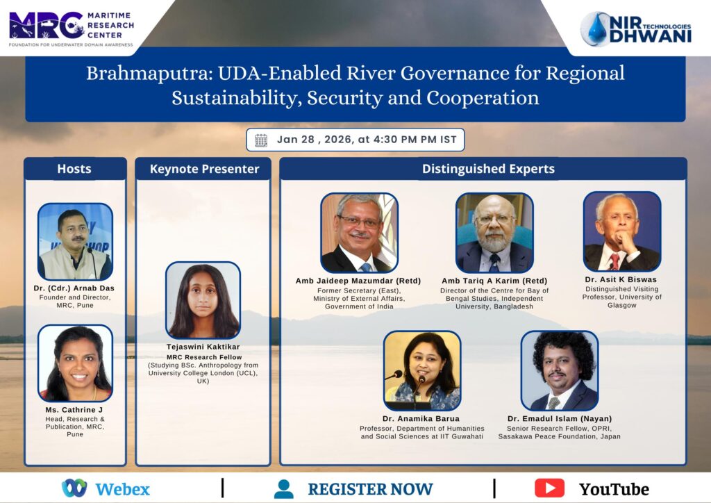 The webinar presents the Brahmaputra River as a dynamic transboundary socio-ecological and strategic system, proposing Underwater Domain Awareness (UDA) and Marine Spatial Planning (MSP) as integrated governance tools to move beyond conventional river management. It addresses challenges related to climate change, flooding, sediment transport, riverbed morphology, ecosystem degradation, navigation, and underwater acoustic environments, while also engaging with geopolitical sensitivities, water diplomacy, and regional security. By bringing together interdisciplinary and cross-border perspectives, the forum aims to strengthen sustainable river governance, climate resilience, and cooperative frameworks across the Brahmaputra basin.